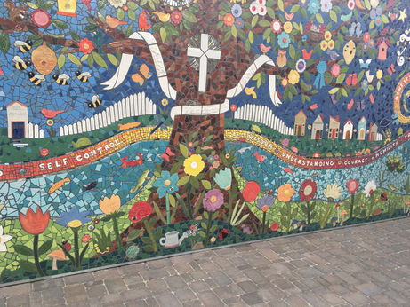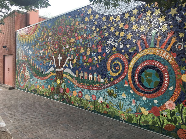 Our first fundraising mosaic mural and our largest one to date. In collaboration with the school’s art teacher and ceramicist, Ann Harris, we created a 384 square foot exterior mural on the Church facade. Several community workshops were held with students, parents, faculty and parishioners to construct the mosaic. The school raised over $125,000.00 from the sale of the tiles. The project was in honor of the schools 70th anniversary. It was a big endeavor and a great success due to the commitment and dedication of all involved.